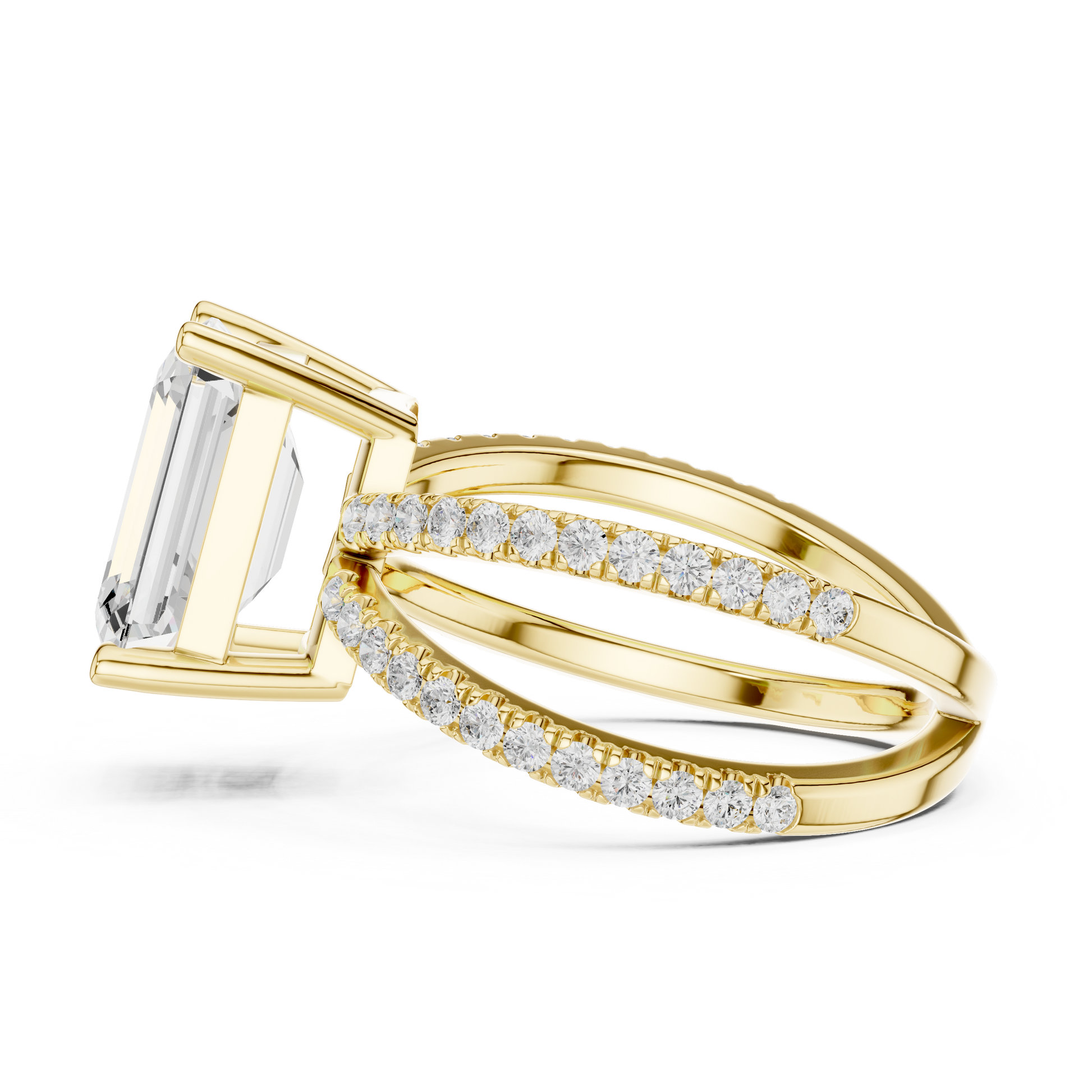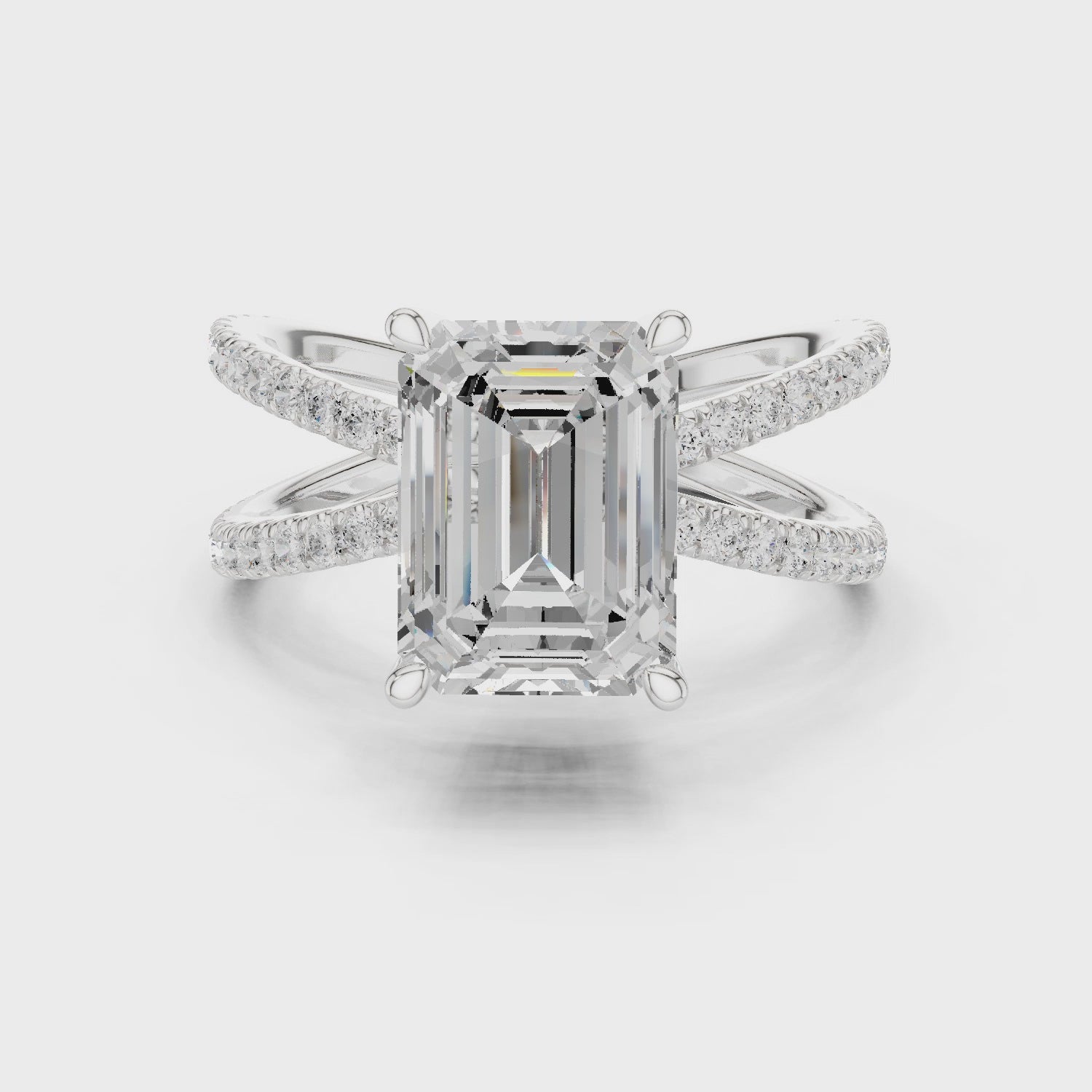 A masterpiece of modern design, this split-shank double pave emerald-cut engagement ring exudes refined confidence and timeless allure. The elongated emerald centre diamond catches light with every movement, while the twin pave bands create a graceful architectural balance around the finger. Handcrafted with precision and set with GIA/IGI certified diamonds, it is the perfect engagement ring for those seeking contemporary elegance, luxury craftsmanship, and a statement that speaks quietly yet powerfully.