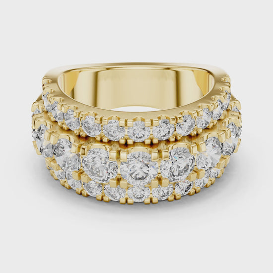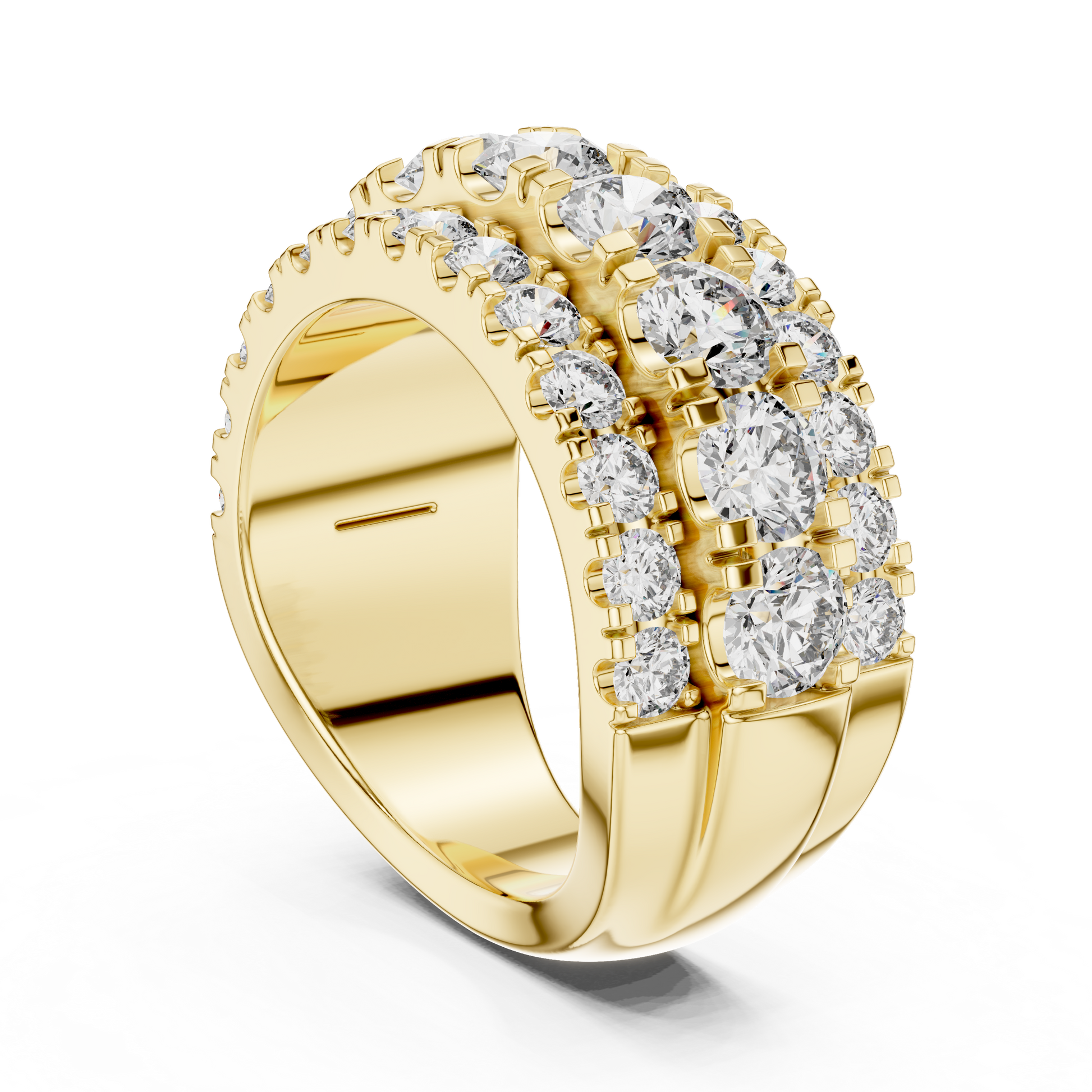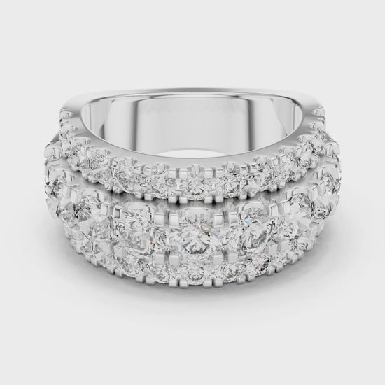 A striking symbol of confidence and refined glamour, this triple-row pave diamond statement band is meticulously handcrafted to radiate brilliance from every angle. Three rows of perfectly matched GIA/IGI certified diamonds create a sculptural, high-impact design that feels both modern and timeless. Whether chosen as a diamond wedding band, a luxury anniversary ring, or a statement piece for special occasions, it embodies elegance, strength, and effortless sophistication.